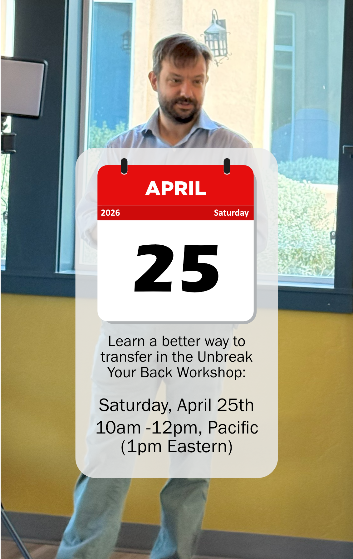 Injury happens in a second... Pain and limitations last for the rest of your life.I charge healthcare companies $500 to give this seminar, but I'm keeping it ridiculously affordable for home and family caregivers in honor of my mom's experience. Get this professional-grade online live course for just $49.Eastern Ergonomics is the only alternative transfer program on the market. Learn simple body mechanics that will protect when you transfer. Protect yourself, keep your loved one safer, and live a healthier life. It's limited to 20 people, so grab your spot ASAP.